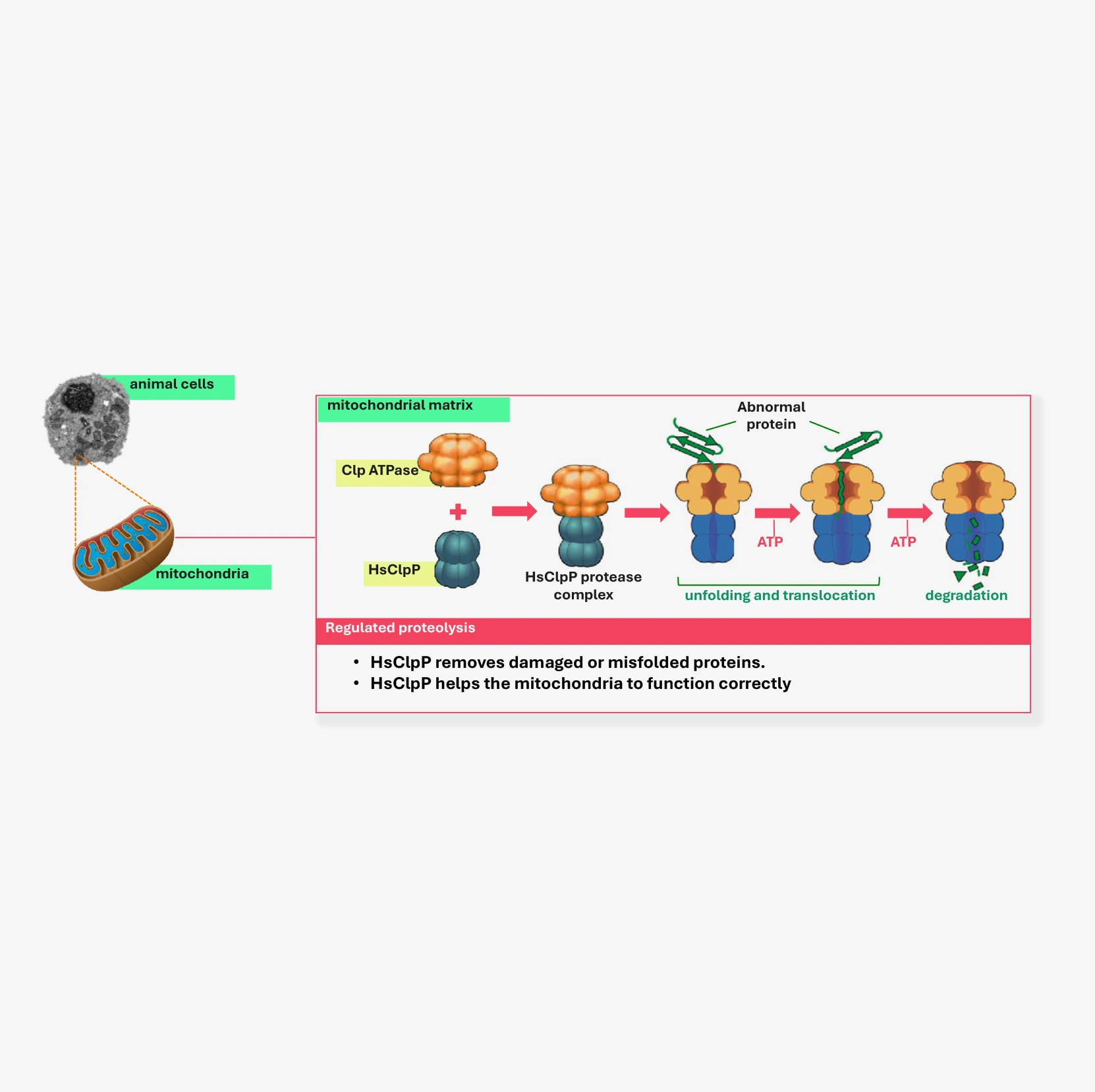 - In particular, HsClpP degrades proteins that are mis-folded or dysfunctional in the mitochondria.