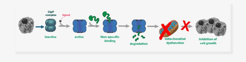 Activated HsClpP acts independently of the chaperones and degrades a greater range of proteins in an uncontrolled manner. This often leads to the degradation of respiratory chain complexes, activation the JNK/c-Jun pathway, and inducing an endoplasmic reticulum (ER) stress response. This response consequently leads to the activation of apoptopic pathways and causes growth arrest in cancer cells (see figure below).
